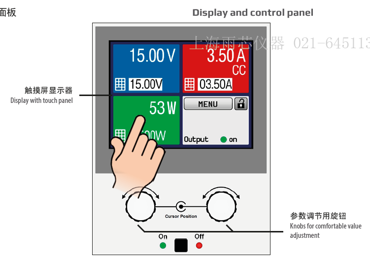設(shè)定與實(shí)際輸出電壓、電流與功率都清晰顯示于圖形顯示器上。彩色的TFT屏幕為點(diǎn)觸式,用一個(gè)手指就能控制所有功能。通過(guò)旋鈕或者數(shù)字鍵盤直接輸入?yún)?shù),也可調(diào)節(jié)設(shè)定電壓、電流或功率。若想防止意外操作,可鎖定所有操作鍵。