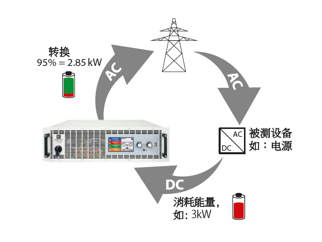 本負(fù)載最主要的特點是,當(dāng)與電網(wǎng)連接時,其AC輸入端,也可用作帶載操作期間所供直流電量返回時的輸出端,且轉(zhuǎn)換效率高達(dá)95%。這種能量轉(zhuǎn)換方式有助于降低用電成本,且避免使用昂貴的制冷系統(tǒng),因為普通電子負(fù)載使用過程中會將直流輸入電量轉(zhuǎn)化成熱量,從而需要制冷系統(tǒng)進(jìn)行冷卻。原理示意圖如下: