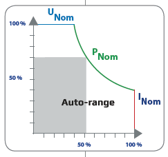 本系列所有型號的輸出功率都可靈活調整。可在較低電流時輸出較高電壓,或在低電壓時輸出較高電流,但總是維持在最大額定輸出功率范圍內。其最大設定功率可調,因此僅用一臺產品就能覆蓋廣泛的應用。
