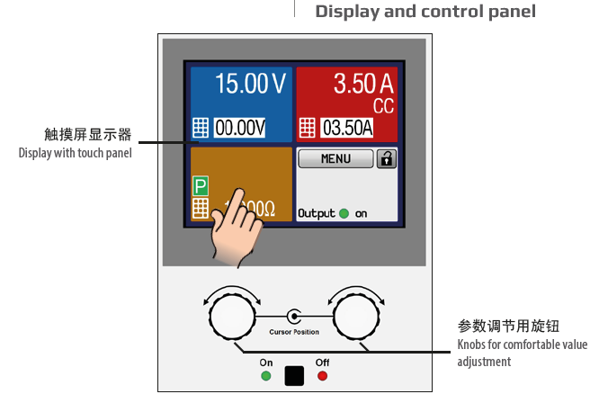 設(shè)定與實際輸出電壓、電流與功率都清晰顯示于圖形顯示器上。彩色的TFT屏幕為點觸式,用一個手指 就能控制所有功能。